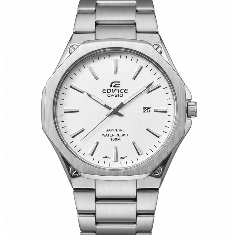 تجسد ساعة Casio Edifice الجديدة المفهوم الحقيقي للأناقة العصرية التي تمزج بين الفخامة الكلاسيكية واللمسات الرياضية الجريئة، مما يجعلها الخيار الأمثل للرجل الذي يبحث عن التميز في أدق تفاصيله. تأتي هذه الساعة الرجالية بهيكل متين مصنوع من المعدن عالي الجودة وهو حجم مثالي يمنح المعصم حضوراً قوياً ومتزناً في آن واحد. وما يميز هذا التصميم هو الإطارالذي يضفي طابعاً من الحداثة والقوة، يحيط بميناء أبيض نقي يتسم بالبساطة الراقية والوضوح التام، مع نافذة لعرض التاريخ عند مؤشر الساعة الثالثة. بينما يكمل السوار المعدني للساعة ليعطي انطباعاً بالثبات والمتانة. إنها قطعة استثنائية صُممت لتناسب نمط الحياة اليومي المزدحم، كما أنها تبرز بوضوح في المناسبات الرسمية والاجتماعات الهامة، وتعتبر هدية فاخرة تعبر عن ذوق رفيع وتقدير عميق، فهي توازن ببراعة بين الدقة اليابانية المعهودة والتصميم الذي لا يحده زمن.