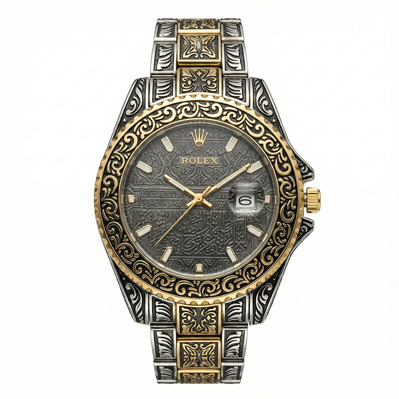 تجسد هذه الساعة من علامة رولكس العريقة قمة الترف والمحاكاة الفنية التي تجمع بين عراقة الماضي وأناقة الحاضر، فهي ليست مجرد أداة لمعرفة الوقت بل هي تحفة فنية رجالية نادرة تعكس ذوقاً رفيعاً ومكانة اجتماعية مرموقة. تأتي الساعة بهيكل متين من المعدن المطلي بلمسات ذهبية فاخرة، ما يميز هذه القطعة الاستثنائية هو طابعها الكلاسيكي المزخرف، حيث يزدان جسم الساعة وسوارها بنقوش دقيقة غاية في الإتقان تمنحها طابعاً ملكياً فريداً. يتألق سوارها المعدني بتناغم لوني مذهل بين الفضي والذهبي، بينما يأتي تصميم المينا باللون الرمادي الداكن المزين بنقوش عربية وإسلامية هندسية معقدة تعطي عمقاً بصرياً لا يقاوم، مع نافذة لعرض التاريخ وعدسة مكبرة تزيد من فخامة التصميم. إنها الخيار المثالي للرجل الذي يبحث عن التميز في المناسبات الرسمية والاحتفالات الكبرى، كما تُعد هدية فاخرة لا تُنسى تعبر عن التقدير والامتنان لمن تحب، فهي قطعة تزداد قيمتها مع مرور الزمن وتضفي لمسة من الوقار على أي إطلالة رسمية.
