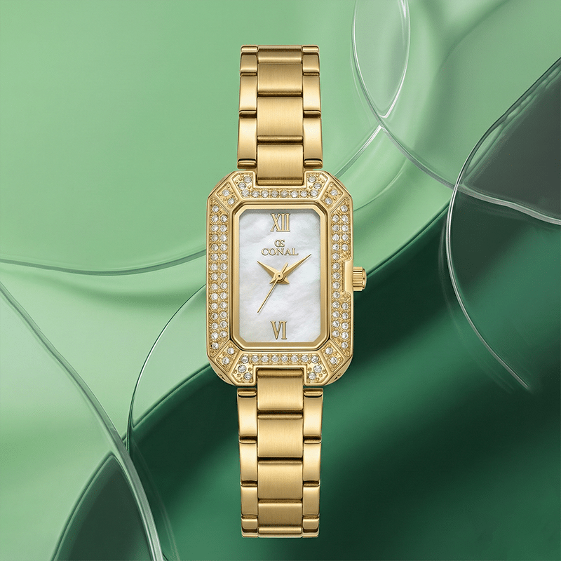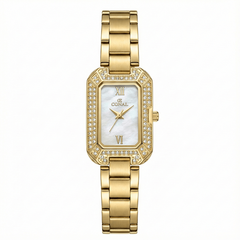 تجسد ساعة كونال (CONAL) النسائية مفهوم الأناقة الكلاسيكية في أبهى صورها، حيث تجمع بين التصميم الهندسي الفريد واللمسات الجمالية الفاخرة التي تمنح معصمكِ حضوراً لافتاً. تأتي هذه الساعة بهيكل مستطيل مصنوع من المعدن المطلي باللون الذهبي اللامع، مما يضمن لكِ الجودة والمتانة مع بريق يدوم طويلاً. يحيط بإطار الساعة ترصيع دقيق من الكريستال المتلألئ الذي يضفي لمسة من الفخامة، بينما يتألق المينا المصنوع من عرق اللؤلؤ الأبيض بتموجاته الطبيعية الساحرة، مع أرقام رومانية ذهبية عند الساعة الثانية عشرة والسادسة تبرز رقي التصميم. يكتمل جمال هذه القطعة بسوار معدني بنمط الوصلات الثلاثية، مما يوفر راحة تامة وثباتاً أنيقاً على المعصم. إنها الخيار الأمثل للمناسبات الرسمية والاحتفالات الكبرى، كما تعد هدية فاخرة تعبر عن الذوق الرفيع، لتكون الرفيق الدائم لكل امرأة تبحث عن التميز والرقي في كل تفاصيل إطلالتها.
