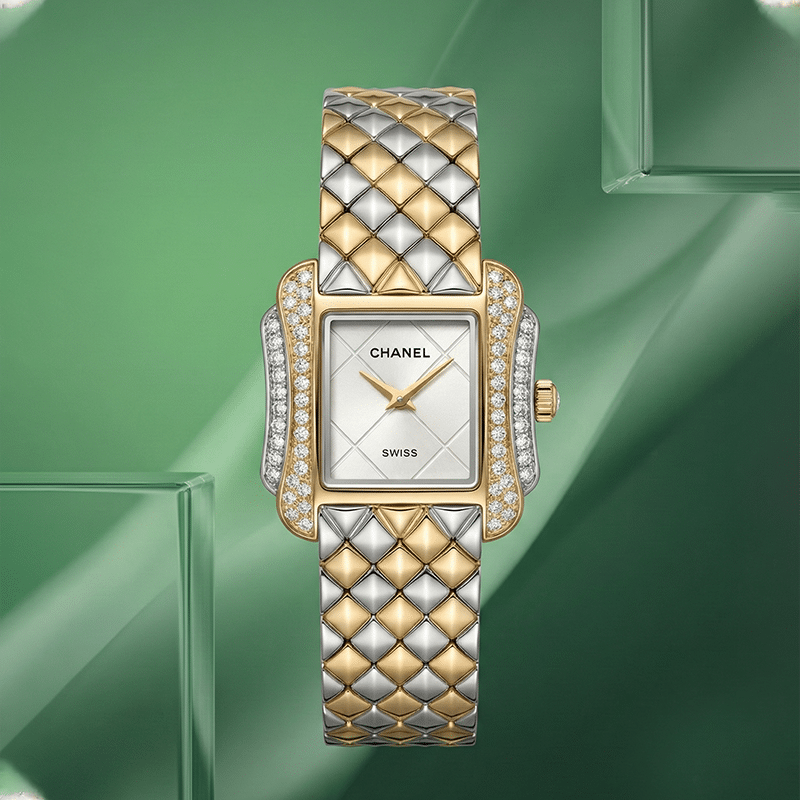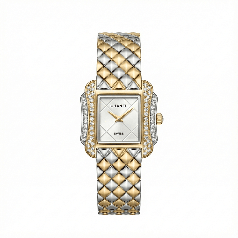 تُجسد هذه الساعة النسائية من دار “شانيل” (CHANEL) العريقة مفهوم الأناقة الفرنسية بلمسة عصرية تتجاوز حدود الزمن، فهي قطعة استثنائية تجمع بين الحرفية العالية والتصميم الهندسي المبتكر. تأتي الساعة بهيكل مستطيل رقيق، مصاغ بمزيج ساحر من المعدن ، مما يمنحها بريقاً يفيض بالفخامة. يبرز جمال هذه القطعة في “المينا” الأبيض المزين بنقوش ماسية الشهيرة، مع عقارب ذهبية ناعمة تزيد من وضوح الوقت ورقيّ المظهر. أما السوار، فهو تحفة فنية بحد ذاته، حيث يأتي بتصميم مترابط يعكس نمط المربعات المبطنة المبدع، متناغماً بين الفضي والذهبي ليناسب مختلف الأذواق. وتكتمل هذه اللوحة الفاخرة بترصيع دقيق من الألماس البراق على جانبي الحواف، مما يجعلها الخيار الأول للمناسبات الرسمية واللحظات الخاصة التي تتطلب حضوراً لافتاً. إنها ليست مجرد أداة لمعرفة الوقت، بل هي جوهرة فاخرة تعكس ذوق السيدة العصرية، وتعد هدية مثالية تعبر عن التقدير والتميز في أبهى صوره.