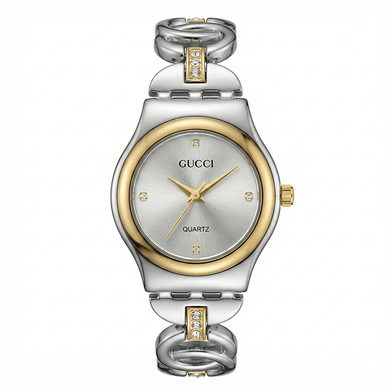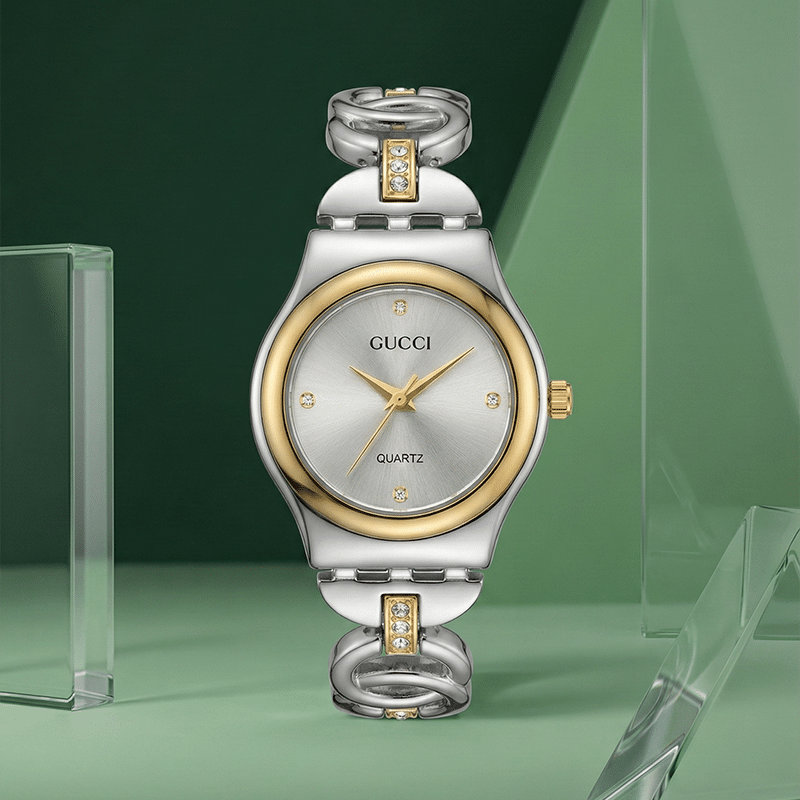 تجسد هذه الساعة النسائية من علامة “غوتشي” العريقة مزيجاً استثنائياً بين الفخامة الكلاسيكية واللمسات العصرية المبتكرة، حيث صُممت لتكون قطعة فنية تزين معصم المرأة العصرية الباحثة عن التميز. تأتي الساعة بجسم مصقول بعناية من المعدن، يتألق المينا الفضي بلمعة شعاعية ساحرة تبرز معها عقارب ذهبية رفيعة، ويزداد جماله بأربعة فصوص براقة تحدد الاتجاهات الرئيسية، مما يضفي بريقاً يحاكي المجوهرات النفيسة. أما السوار، فهو بطل التصميم بلا منازع، حيث يدمج بين حلقات المعدن الفضية المتداخلة بأسلوب هندسي فريد مع لمسات ذهبية مرصعة بأحجار الزركون اللامعة، ليعكس تناغماً لونياً مذهلاً بين الفضي والذهبي. إنها ليست مجرد أداة لمعرفة الوقت بفضل محرك الكوارتز الدقيق، بل هي رفيق مثالي للمناسبات الرسمية والاحتفالات الكبرى، كما تعد خياراً مذهلاً لتقديمها كهدية فاخرة تعبر عن ذوق رفيع وتقدير عميق.