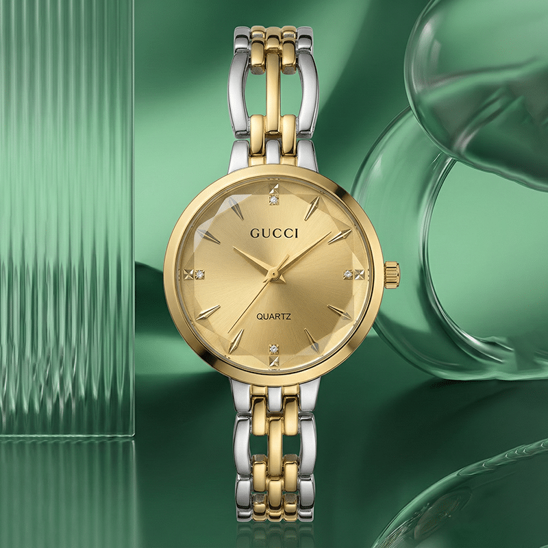 تجسد هذه الساعة النسائية من “غوتشي” مفهوم الأناقة الإيطالية الخالدة، حيث تمزج بين الفخامة الكلاسيكية واللمسات العصرية المبتكرة لتكون قطعة فنية تزين معصم المرأة العصرية. وهي مصنوعة من أجود أنواع المعادن الذي يجمع بين اللمعان والصلابة. يبرز جمال هذه القطعة في مينائها الذهبي المشع بتأثير “أشعة الشمس”، والمحمي بزجاج كريستالي ذو زوايا هندسية فريدة تعكس الضوء بأسلوب ساحر، مع ترصيعات دقيقة عند الأرقام الأساسية تضفي بريقًا خافتًا وراقيًا. أما السوار، فهو تصميم استثنائي يجمع بين الذهب والفضة في حلقات متداخلة وانسيابية تشبه المجوهرات الراقية أكثر من كونها مجرد ساعة تقليدية. إنها الخيار المثالي للمناسبات الرسمية والاجتماعات الهامة، كما تمثل هدية فاخرة تعبر عن الذوق الرفيع، حيث تمنحكِ حضورًا طاغيًا يجمع بين الرقي والتميز في آن واحد.