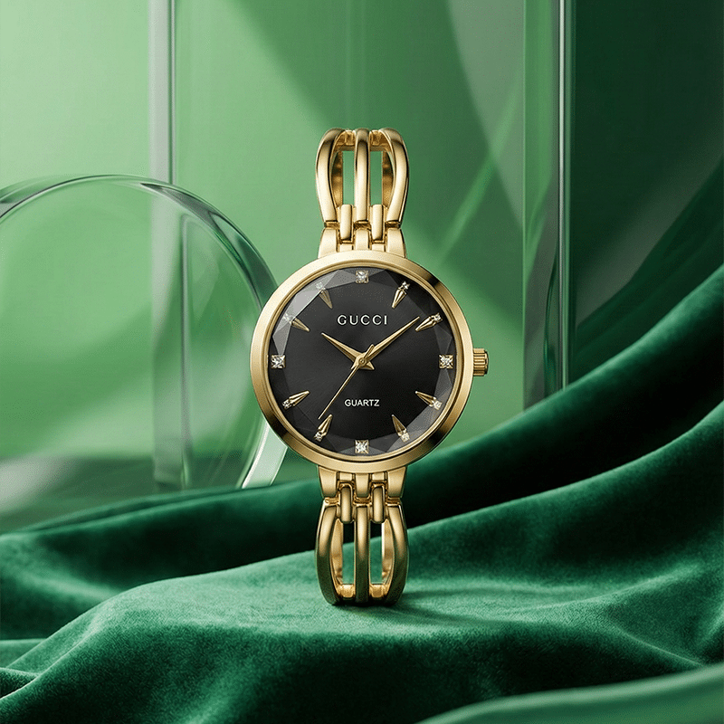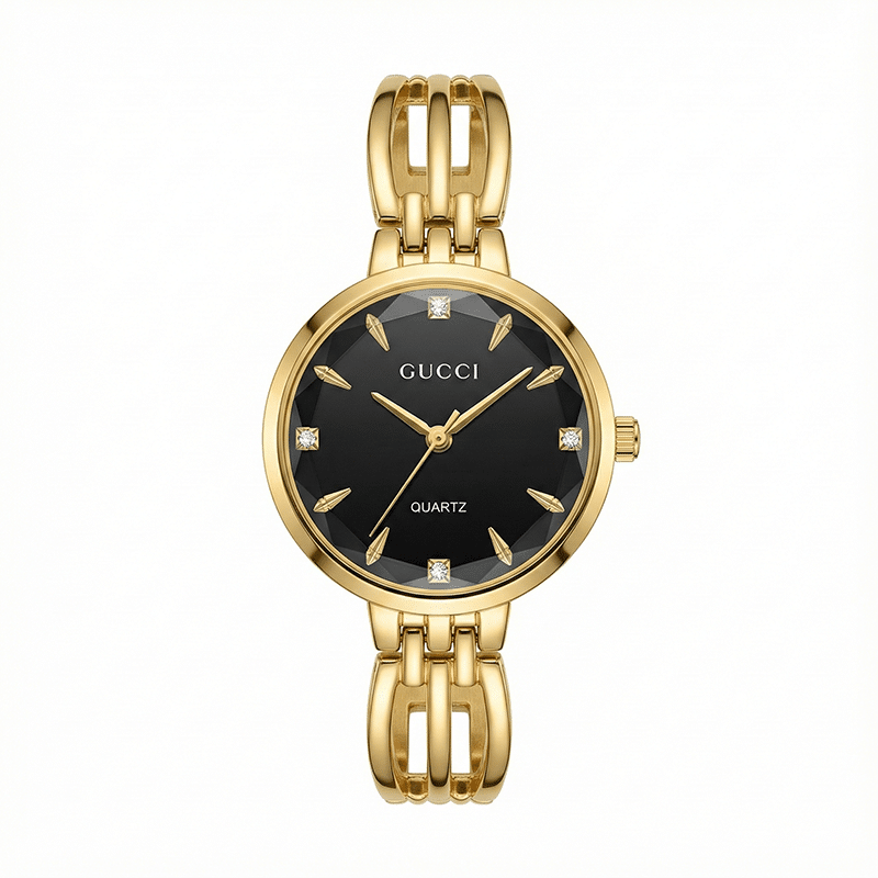 تجسد هذه الساعة من علامة غوتشي العريقة قمة الأناقة النسائية بتصميم يمزج بين الروح الكلاسيكية واللمسات العصرية الفاخرة، مما يجعلها قطعة مجوهرات فريدة تزين معصمك قبل أن تكون مجرد أداة لقياس الوقت. مع هيكل متين مصنع من المعدن المطلي باللون الذهبي اللامع الذي يعكس الضوء ببريق آسر. يتجلى الإبداع في المينا الأسود الفاخر الذي يتميز بتصميم “أشعة الشمس” وتفاصيل هندسية دقيقة، يتوسطها شعار جوتشي العريق، وتزدان بوجود فصوص كريستالية عند الساعات الرئيسية تضفي لمسة من الفخامة والتميز. أما السوار، فهو تحفة فنية بحد ذاته، حيث يأتي بتصميم حلقي ذهبي مفتوح يمنح الساعة طابعاً يشبه الأساور الفاخرة، مما يجعلها الخيار الأول للمناسبات الرسمية والاحتفالات الكبرى، أو كهدية فاخرة تعبر عن الذوق الرفيع. إنها الساعة التي ترافقك في أرقى لحظاتك لتضفي على إطلالتك بريقاً لا ينسى وثقة لا حدود لها.