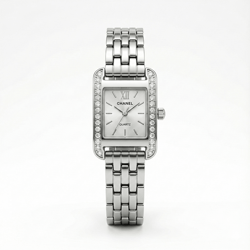 تجسد هذه الساعة من “شانيل” مفهوم الأناقة السرمدية التي تجمع بين الرقي الفرنسي والدقة المتناهية، فهي قطعة فنية مصممة خصيصاً للمرأة التي تعشق التفاصيل الفاخرة واللمسات الكلاسيكية بأسلوب عصري. صُنع جسم الساعة وسوارها من المعدن ذو الجودة العالية، والذي يتميز بلمعان براق يعكس الضوء مع كل حركة. يزدان إطار الساعة بصفين من الفصوص الكريستالية اللامعة التي تضفي بريقاً يشبه الألماس، مما يرفع من قيمتها الجمالية لتكون أكثر من مجرد أداة لمعرفة الوقت، بل هي قطعة مجوهرات ثمينة. أما المينا، فتأتي بلون فضي شعاعي نقي، مزينة بعقارب رقيقة ومؤشر روماني عند الساعة الثانية عشرة، مما يمنحها مظهراً ملكياً هادئاً. إن هذه الساعة هي الخيار الأمثل للمناسبات الرسمية والسهرات الراقية، كما تعد هدية فاخرة تعبر عن الذوق الرفيع والتقدير العميق لمن تحبين.
